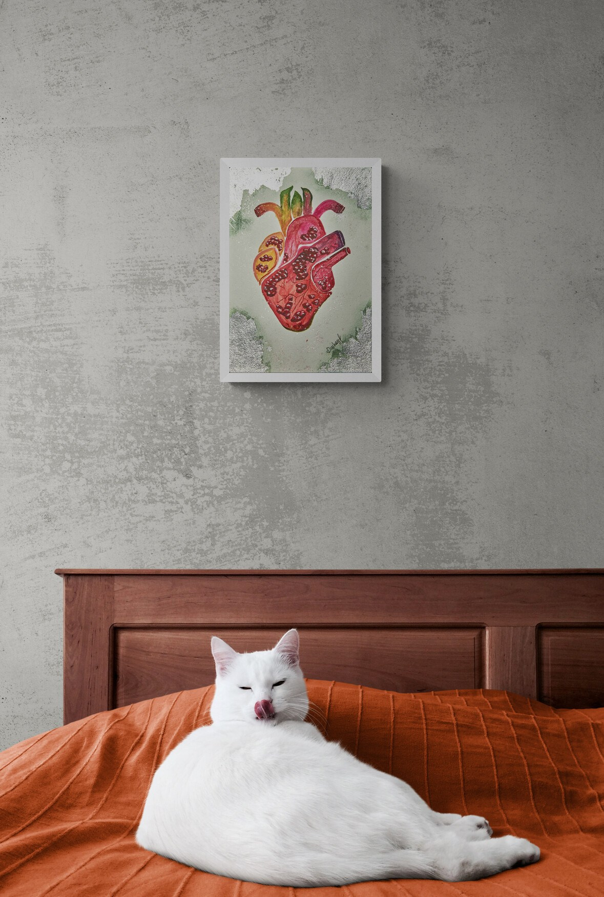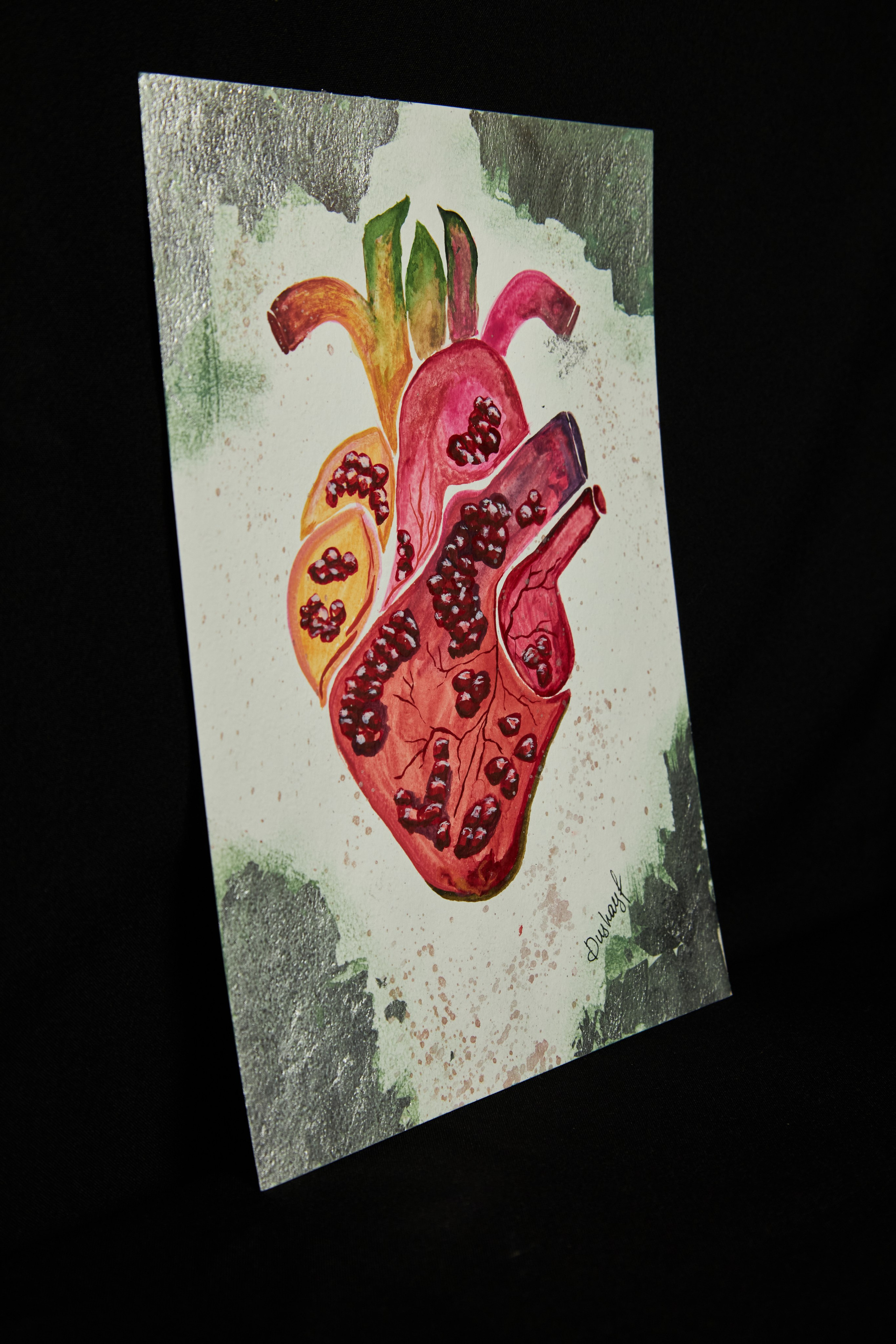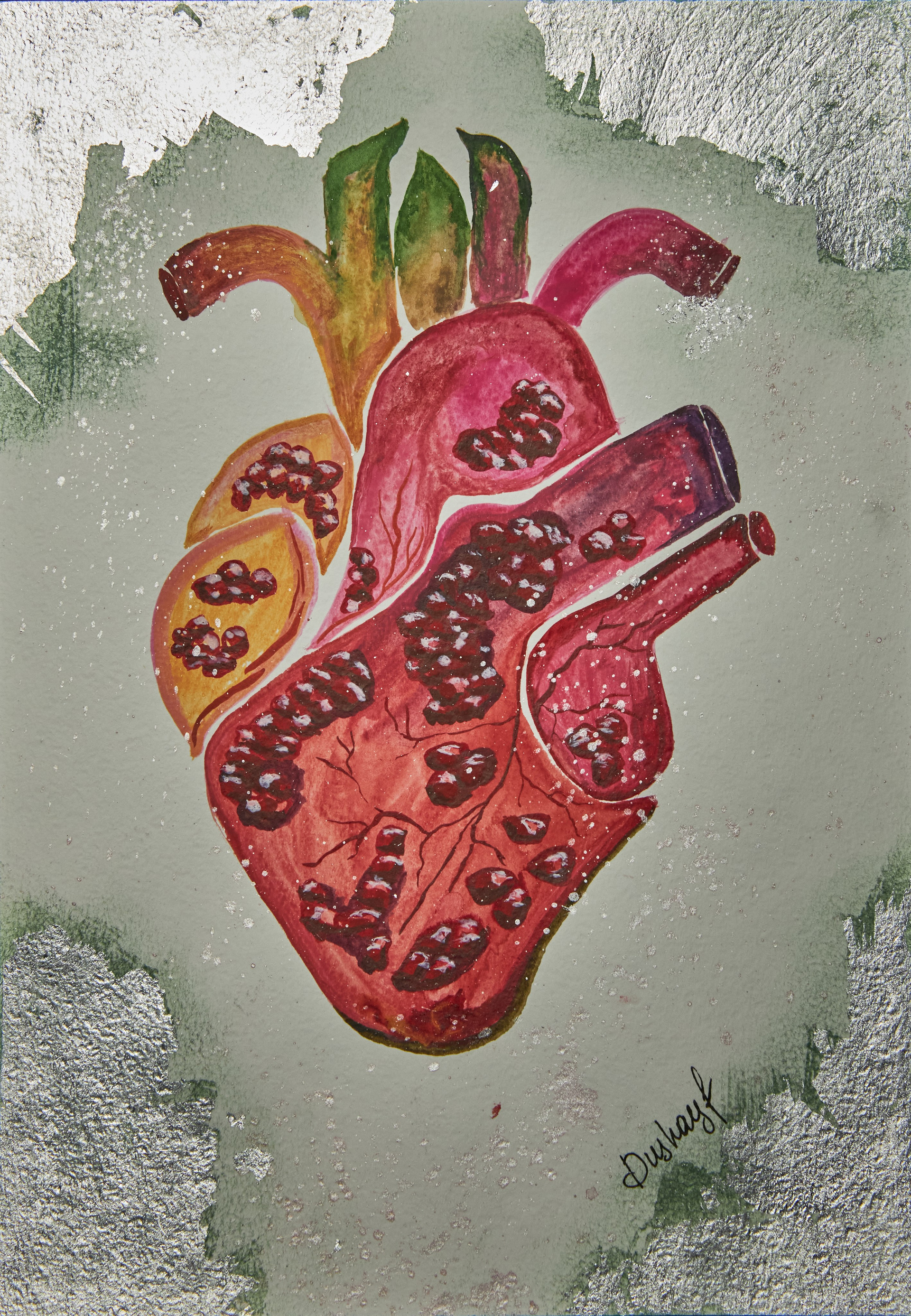Откройте для себя мощный символ жизни, эмоций и природы в этой сюрреалистической акварели, представляющей собой анатомический натюрморт, где человеческое сердце переосмыслено как форма, созданная из зёрен граната и сегментов фрукта. Слияние анатомии и природы выражает глубокую связь между жизненной энергией и ростом — поэтическую медитацию о сути бытия.