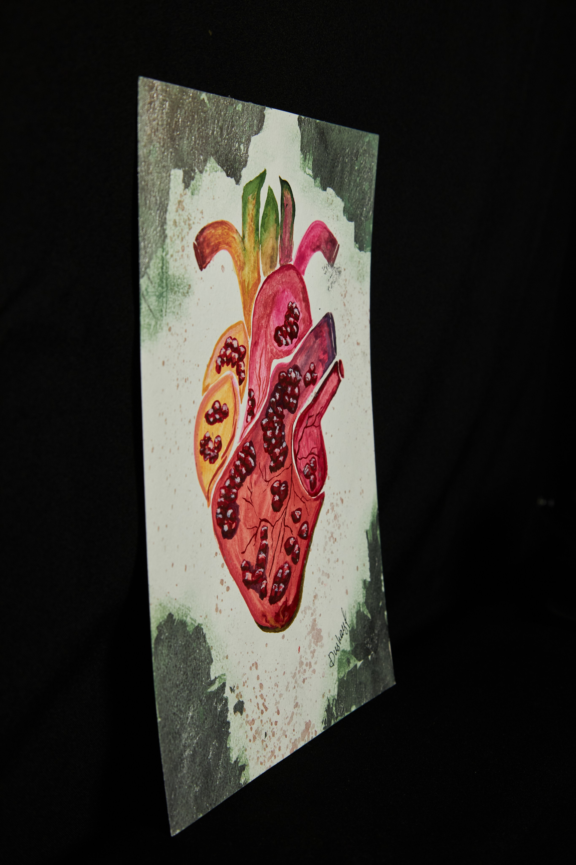Сюрреалистическая акварельная натюрморт-картина с анатомическим сердцем из зёрен граната. Год создания 2025. Size: 30 × 21 (unframed) A4
