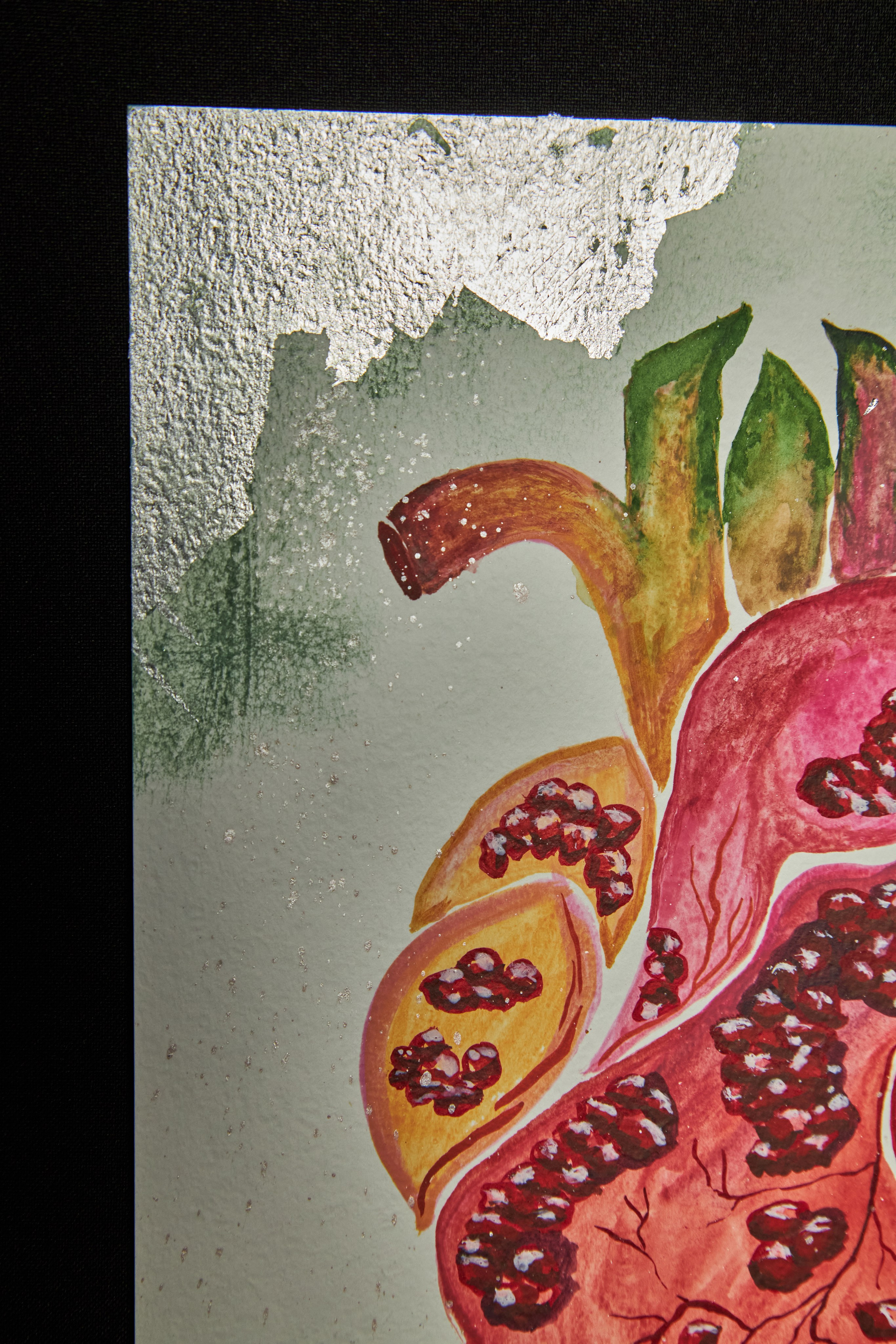 Картина наполнена яркими красными и тёплыми оранжевыми тонами, создающими ощущение живой пульсации. Каждая вена и зерно прорисованы с тончайшей точностью, объединяя органические фактуры и прозрачные акварельные слои, воплощающие одновременно хрупкость и силу. Фон выполнен в мягком серебристо-зелёном тоне с легкими металлическими бликами и брызгами, усиливающими сновидческое настроение композиции.