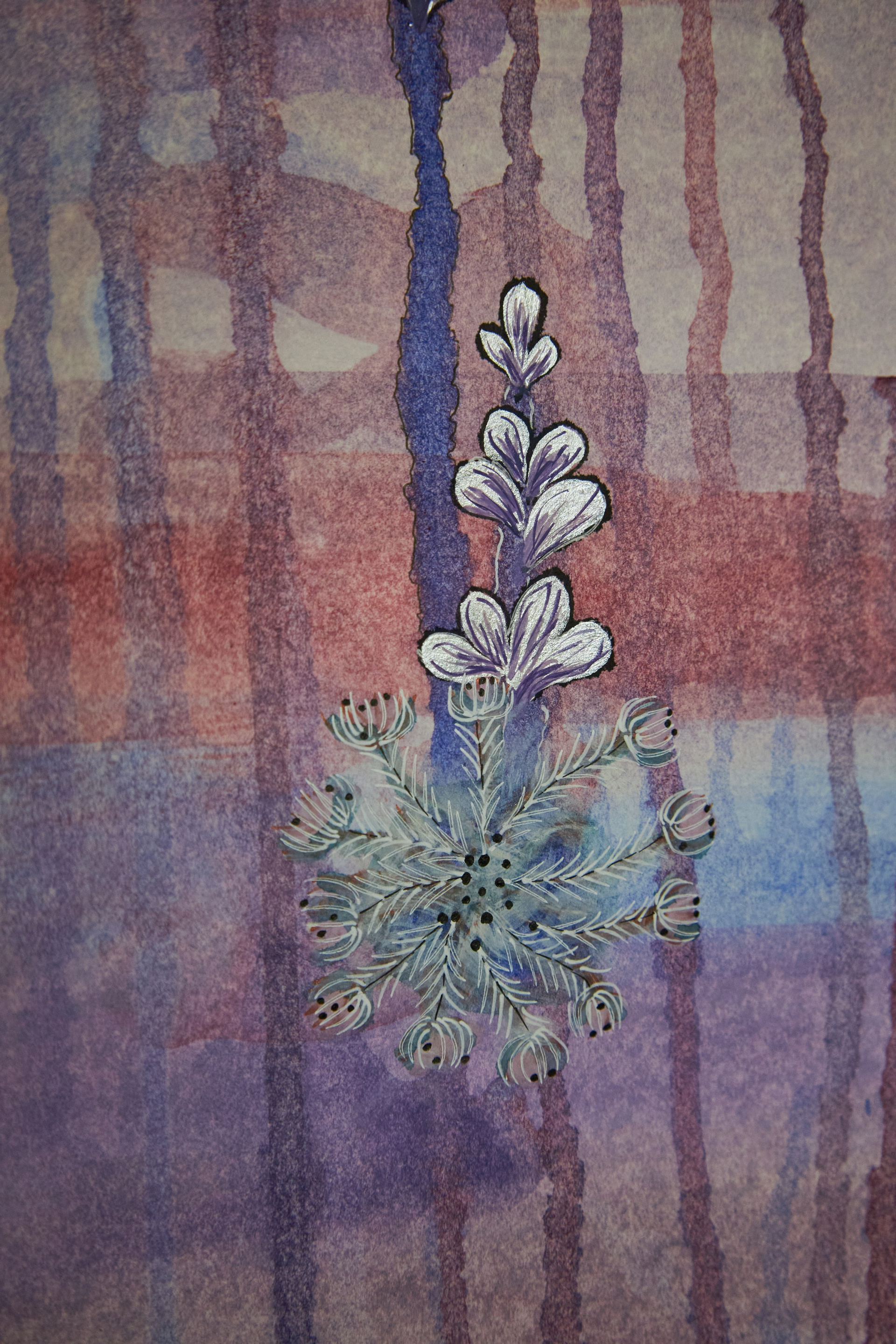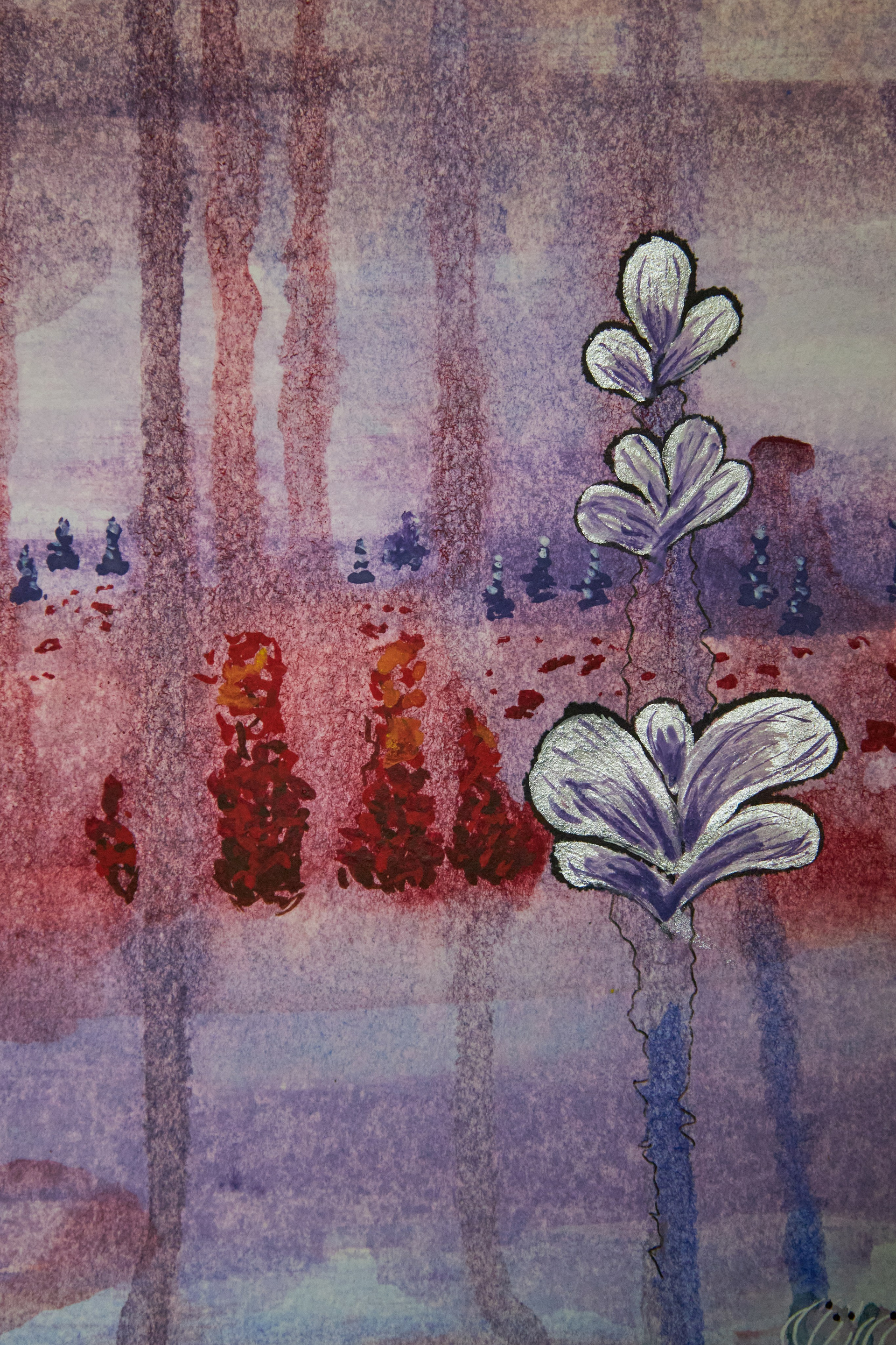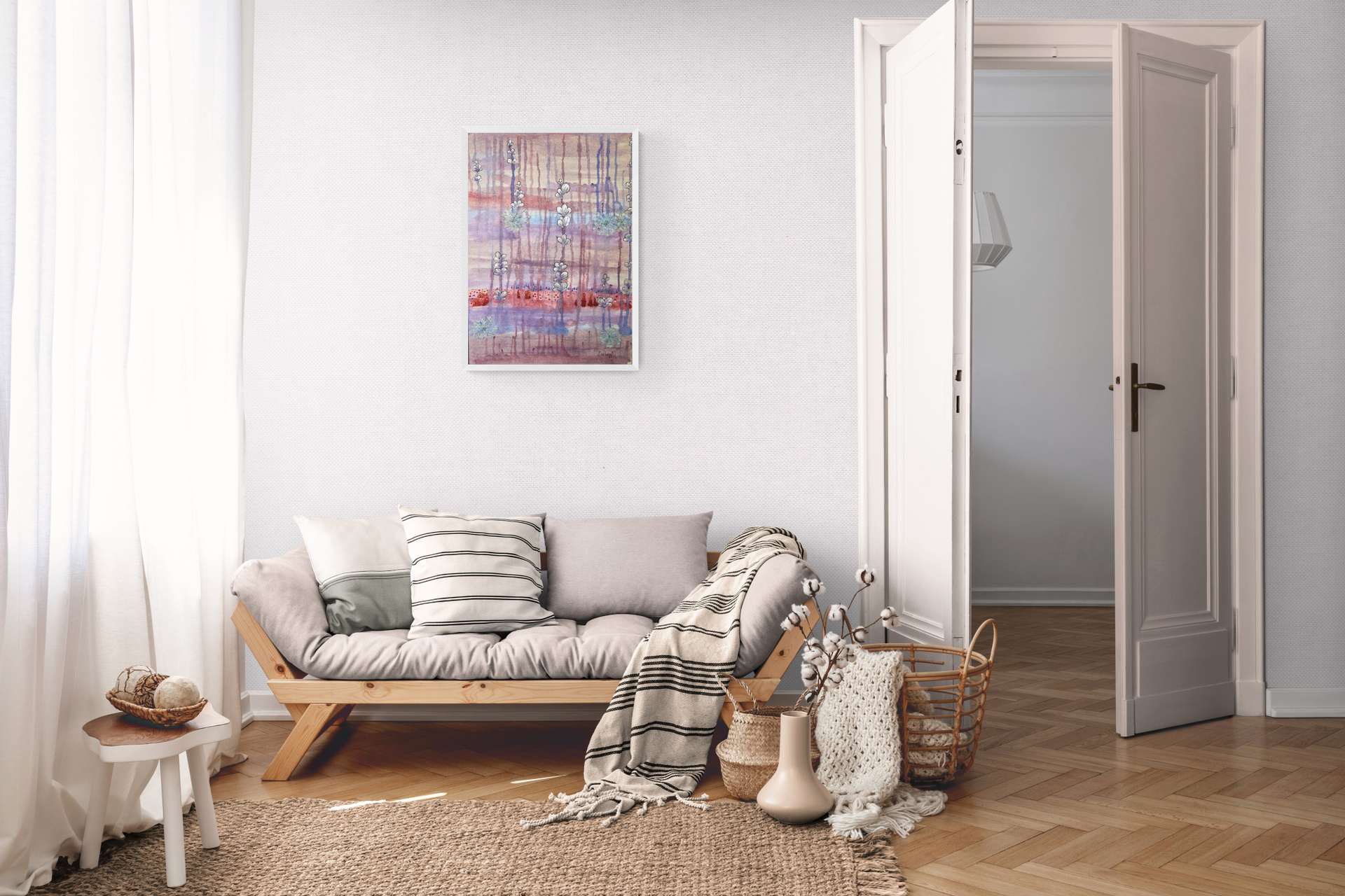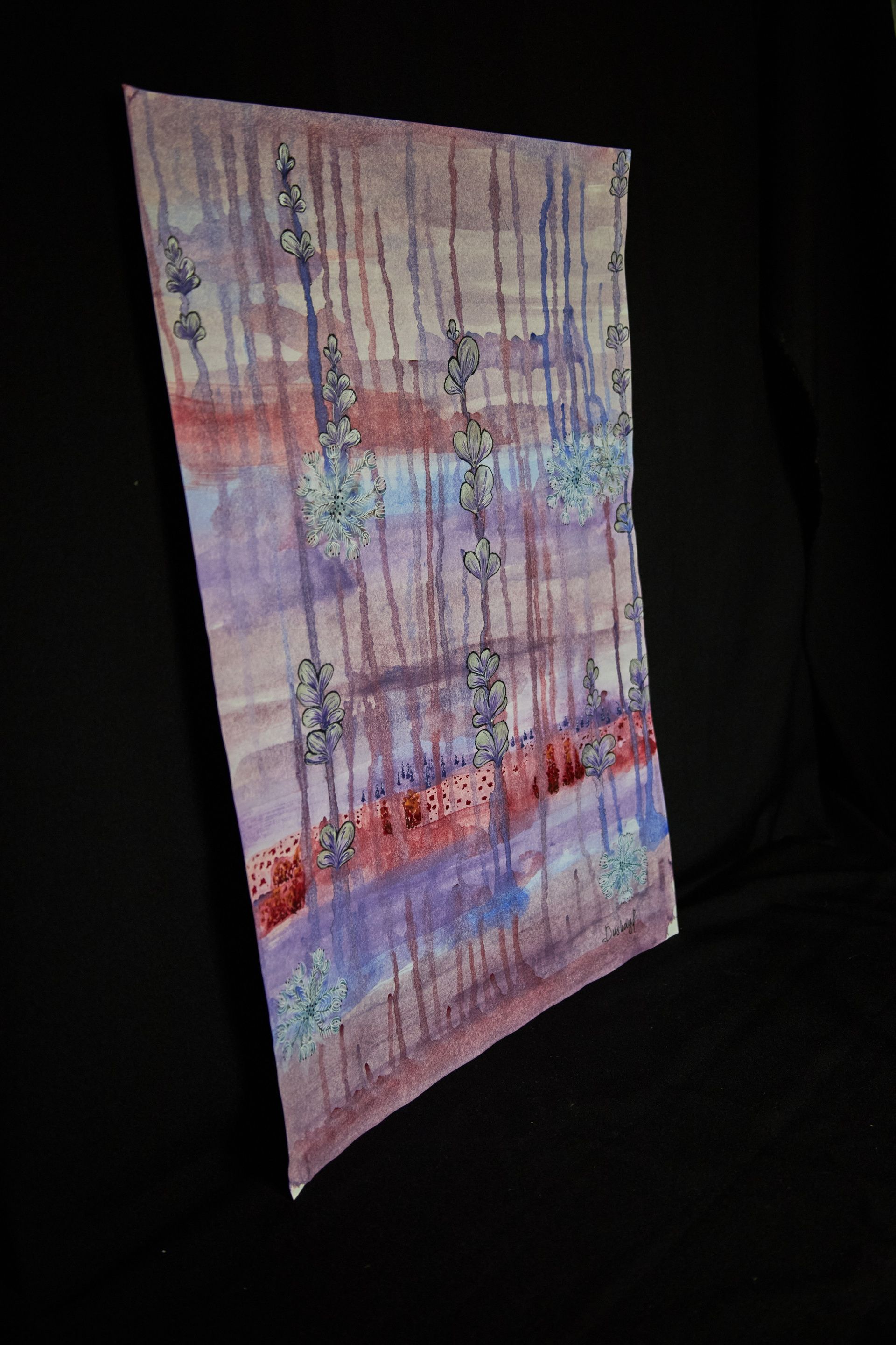 Это оригинальное произведение объединяет элементы пейзажа, флоры и абстрактного искусства, создавая медитативную и сновидческую атмосферу. Тонкие вертикальные формы, напоминающие растения, переплетаются с изящными цветочными узорами, образуя динамичную композицию в прозрачных слоях лавандовых, сиреневых и розовых оттенков.