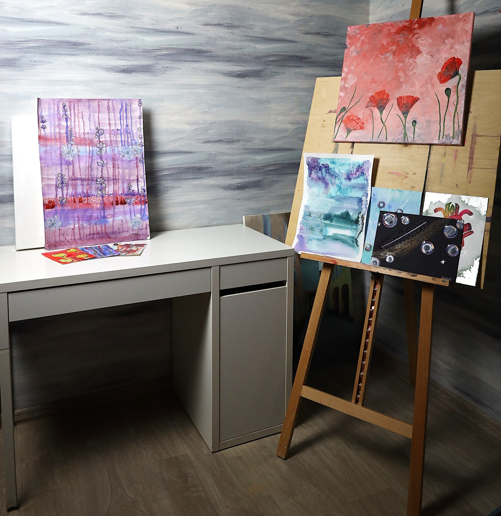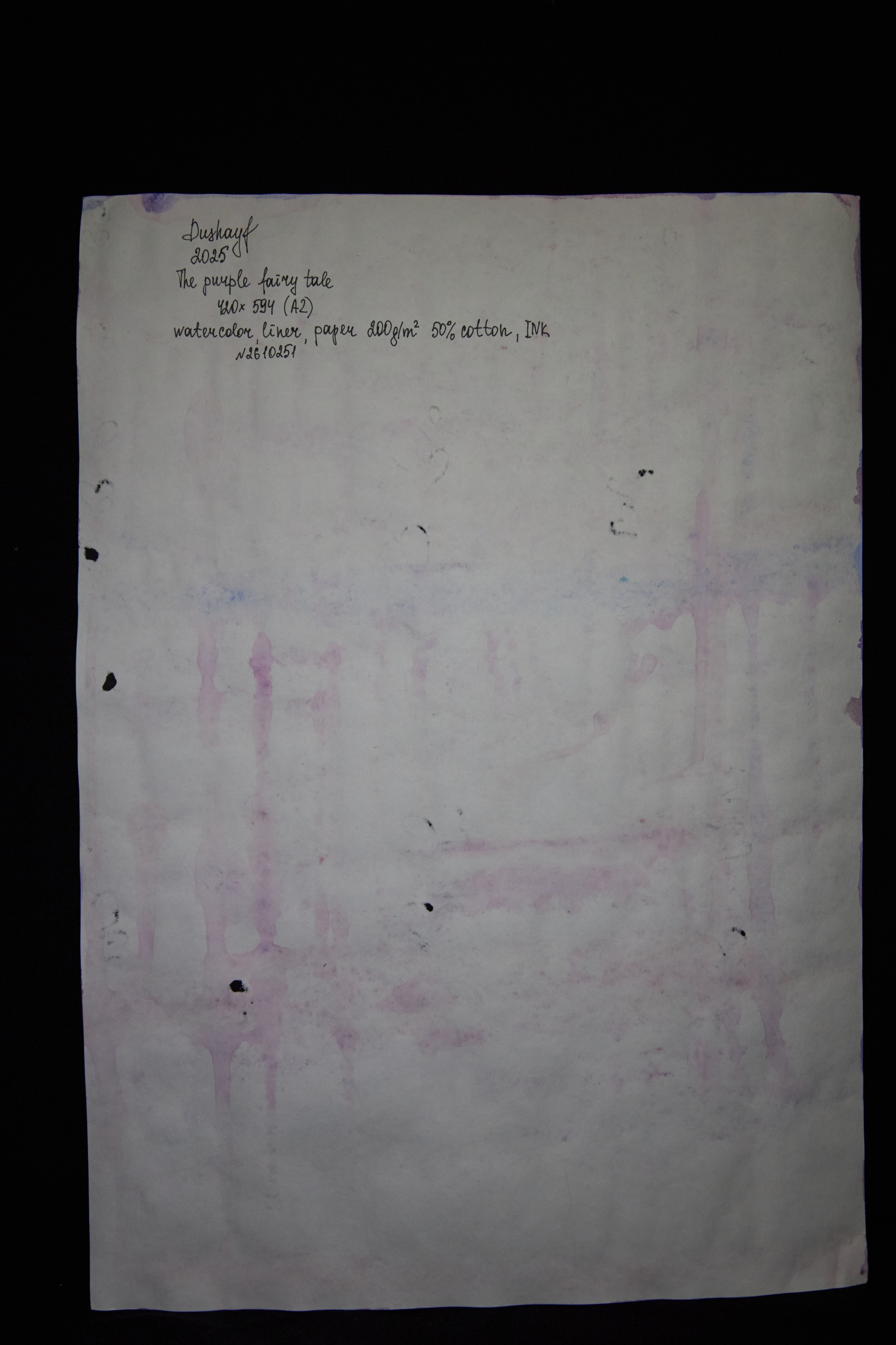 Фон картины соткан из мягких пурпурных и тёплых розовых тонов с лёгкими акцентами голубого, что наполняет пространство глубиной и светом. Полупрозрачные заливки и деликатные потёки придают работе ощущение движения, текучести и лёгкой сюрреальности.