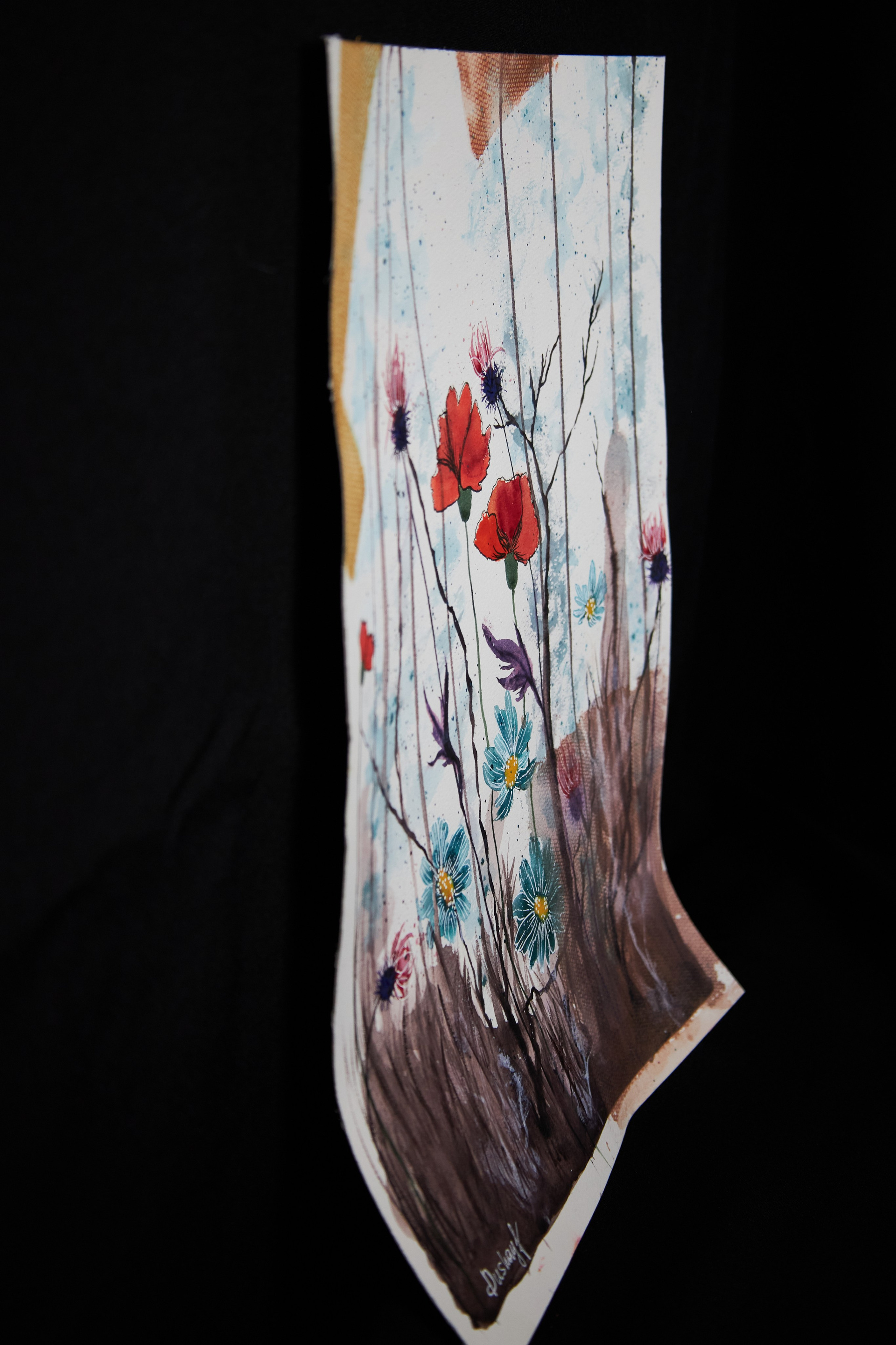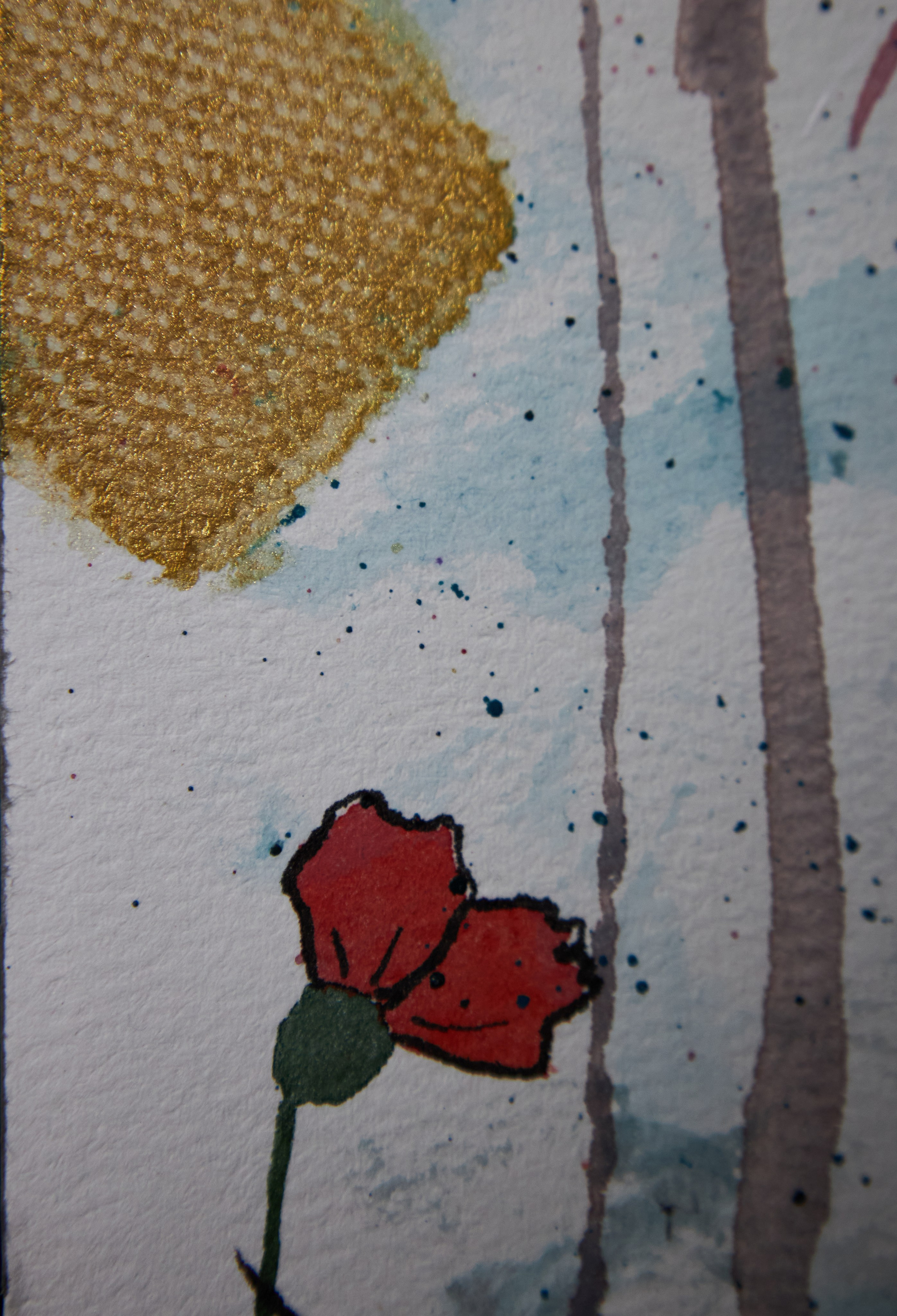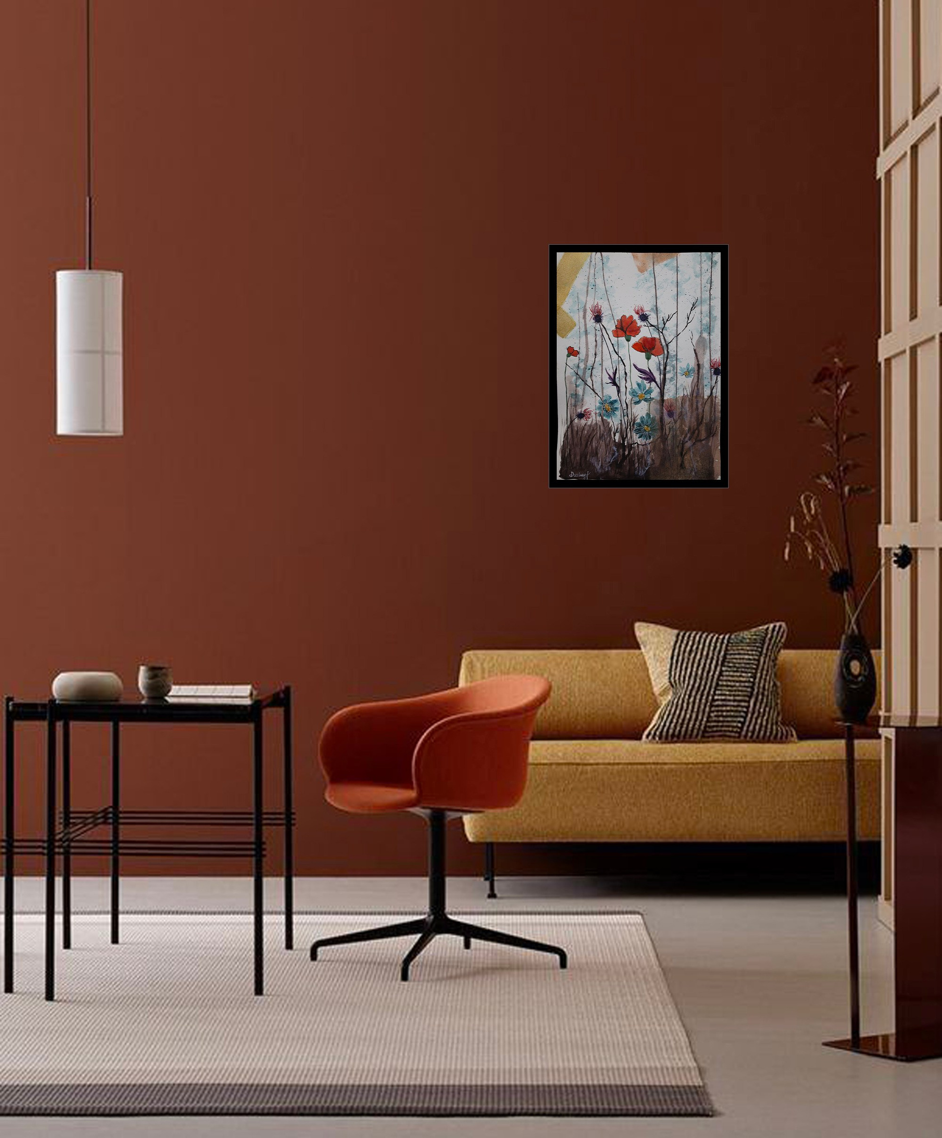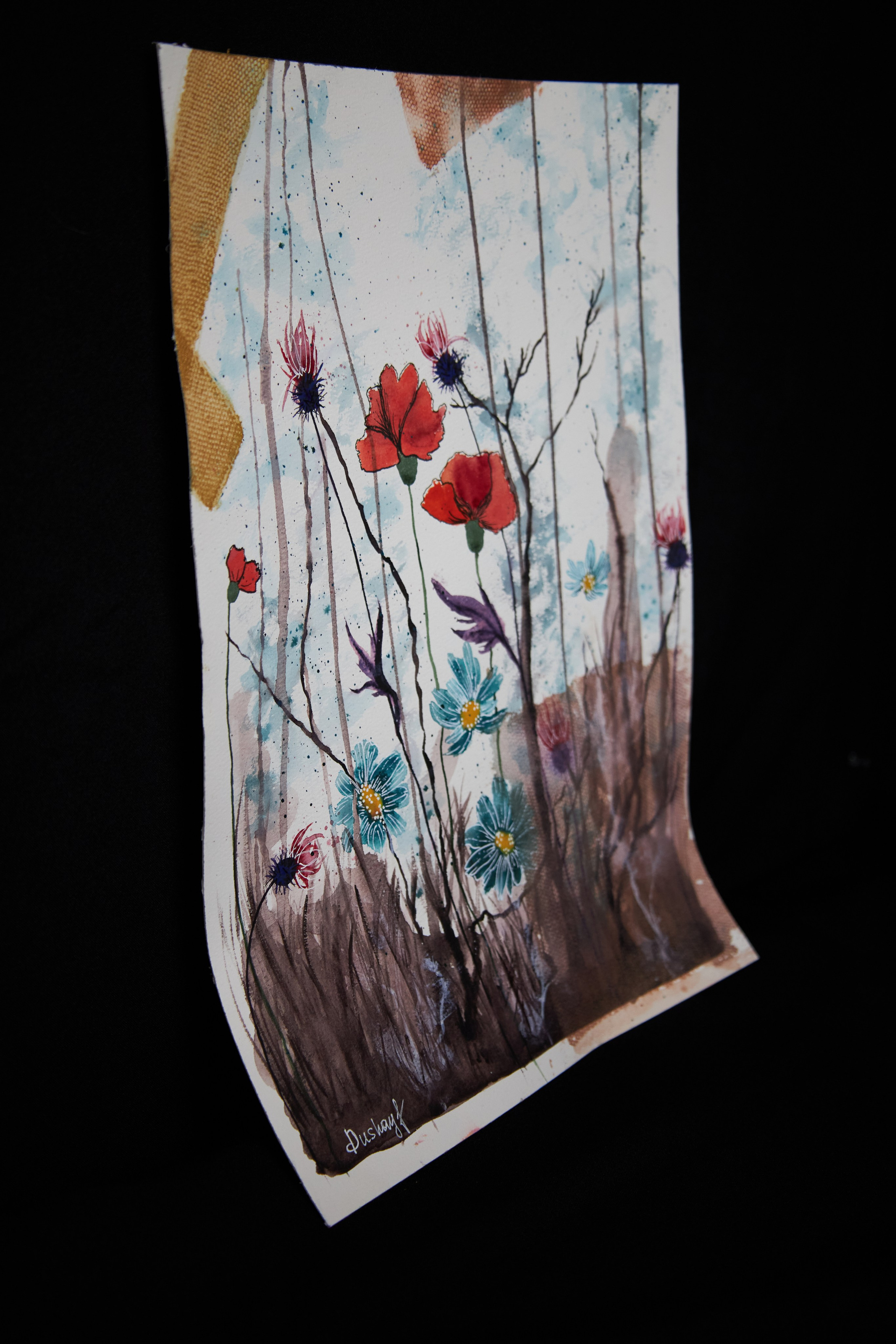 Тонкие чёрные стебли переплетаются между цветами, создавая ритм и глубину композиции. Золотистые кружевные текстуры добавляют теплоты и сияния, словно солнечные отблески на лепестках. Мягкие всплески голубого и коричневого оттенков придают работе ощущение естественного движения и пространства — словно лёгкий ветер колышет травы под небом.