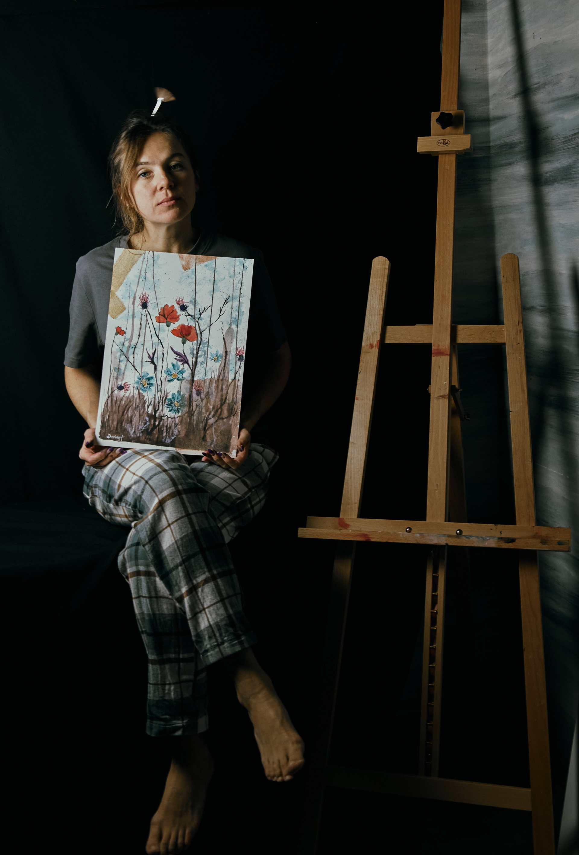 Фон выполнен прозрачными слоями небесно-голубых и приглушённых земляных тонов, что создаёт воздушную, светлую атмосферу, где реальность и абстракция сливаются воедино. Каждая деталь уравновешена: это гармоничное сочетание поэтичности, спокойствия и природной живости.