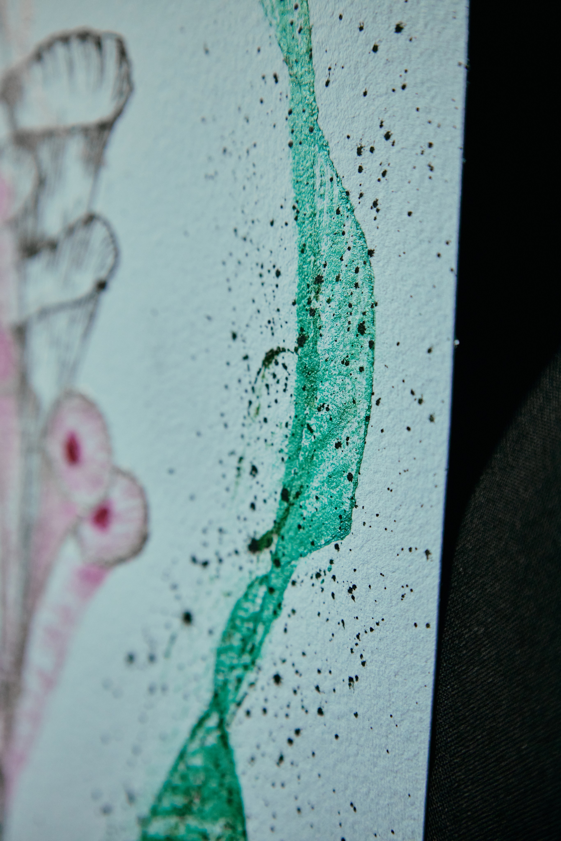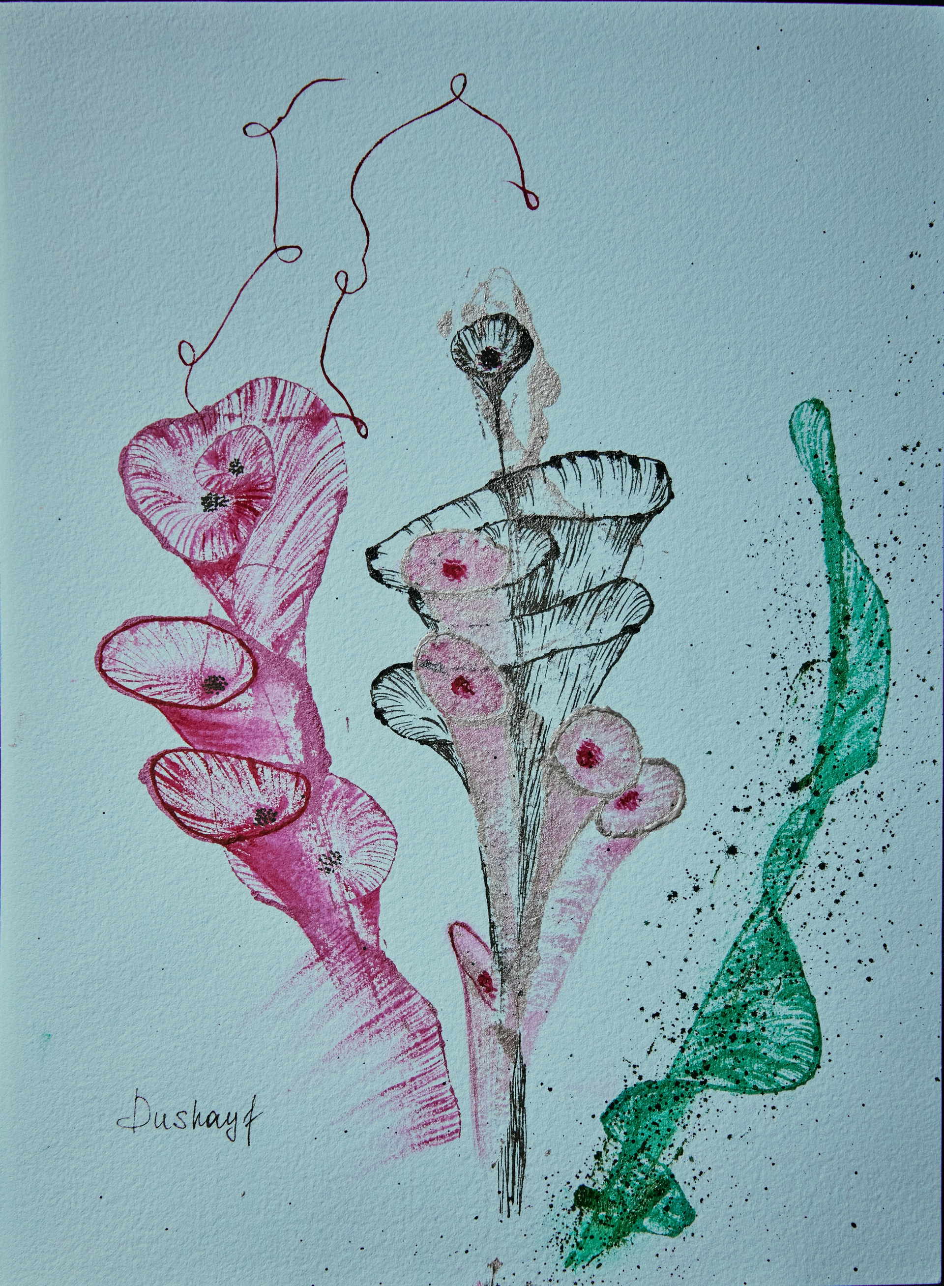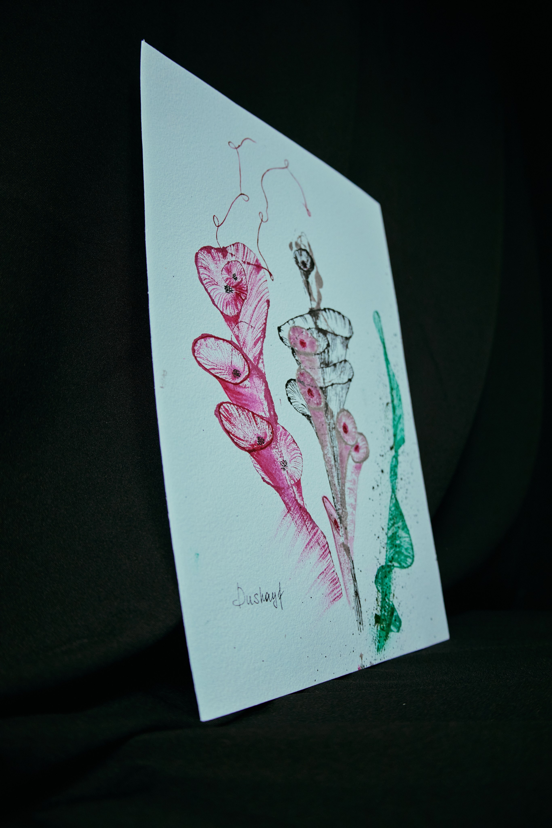Эта современная абстрактная ботаническая работа объединяет линер, акрил и акварель, создавая изящную интерпретацию вытянутых цветочных форм в насыщенной мадженте, бледном металлическом золоте и мягких текучих зелёных оттенках. Тонкая линейная проработка, петлеобразные линии и деликатные брызги акварели добавляют текстуру и движение, сохраняя ощущение лёгкости и сдержанности. Композиция расположена на голубом фоне с большим количеством «воздуха», что позволяет формам дышать, а цветам — мягко светиться.