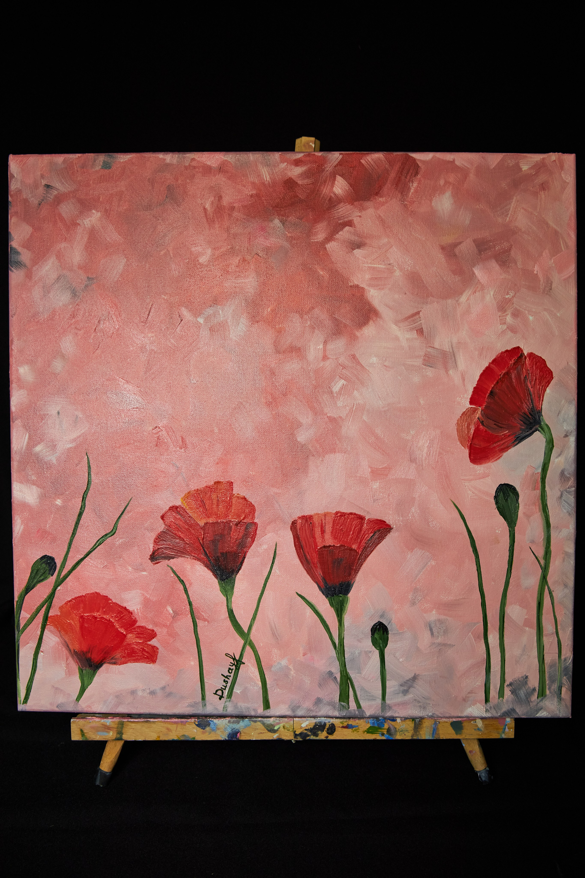 На полотне изображены высокие красные маки с зелёными стеблями, чьи лепестки, написанные мягкими, плавно смешанными мазками, передают лёгкое движение и игру света. Кажется, что цветы колышутся под нежным дыханием ветра.