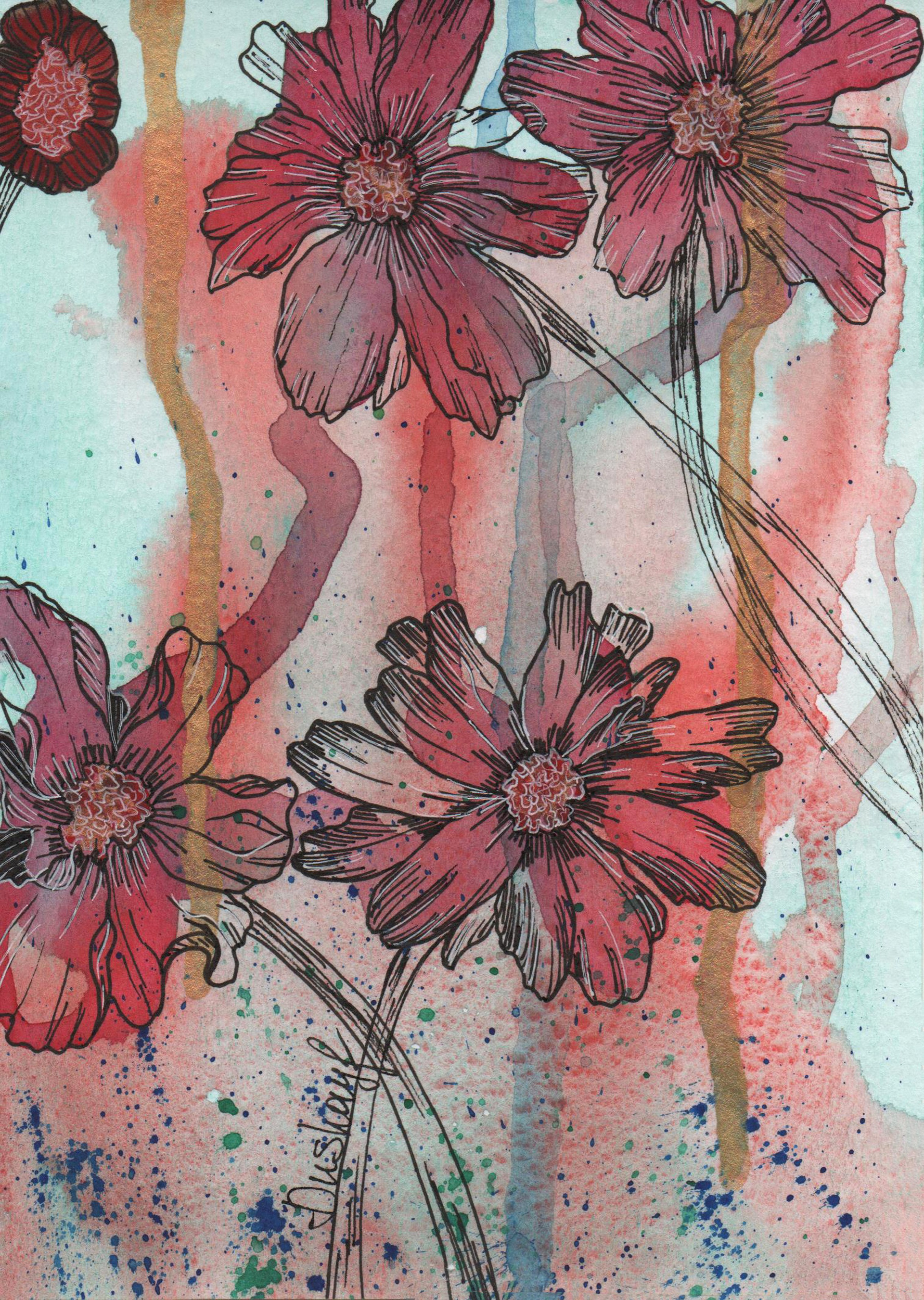 Эта экспрессивная акварель показывает крупные розовые цветы, обведённые тонкими чёрными линиями, соединяя современную ботаническую иллюстрацию с элементами абстрактного экспрессионизма. Мягкие брызги, текучие потёки и тонкая линия создают ощущение движения и нежности, будто каждый лепесток живёт своей собственной эмоцией. Фон сочетает аква, коралловые и розовые оттенки, добавляя лёгкость и воздушность, которые подчёркивают яркость цветов. Работа несёт мечтательное, вдохновляющее настроение — именно тот визуальный импульс, который оживляет пространство и приносит эмоциональное тепло. Картина подойдёт коллекционерам современных флоралей, выразительной акварели и декора, вдохновлённого природой. Она гармонично смотрится в минималистичных интерьерах, художественных пространствах и в любом доме, где ценят мягкость, цвет и эмоциональную тонкость.