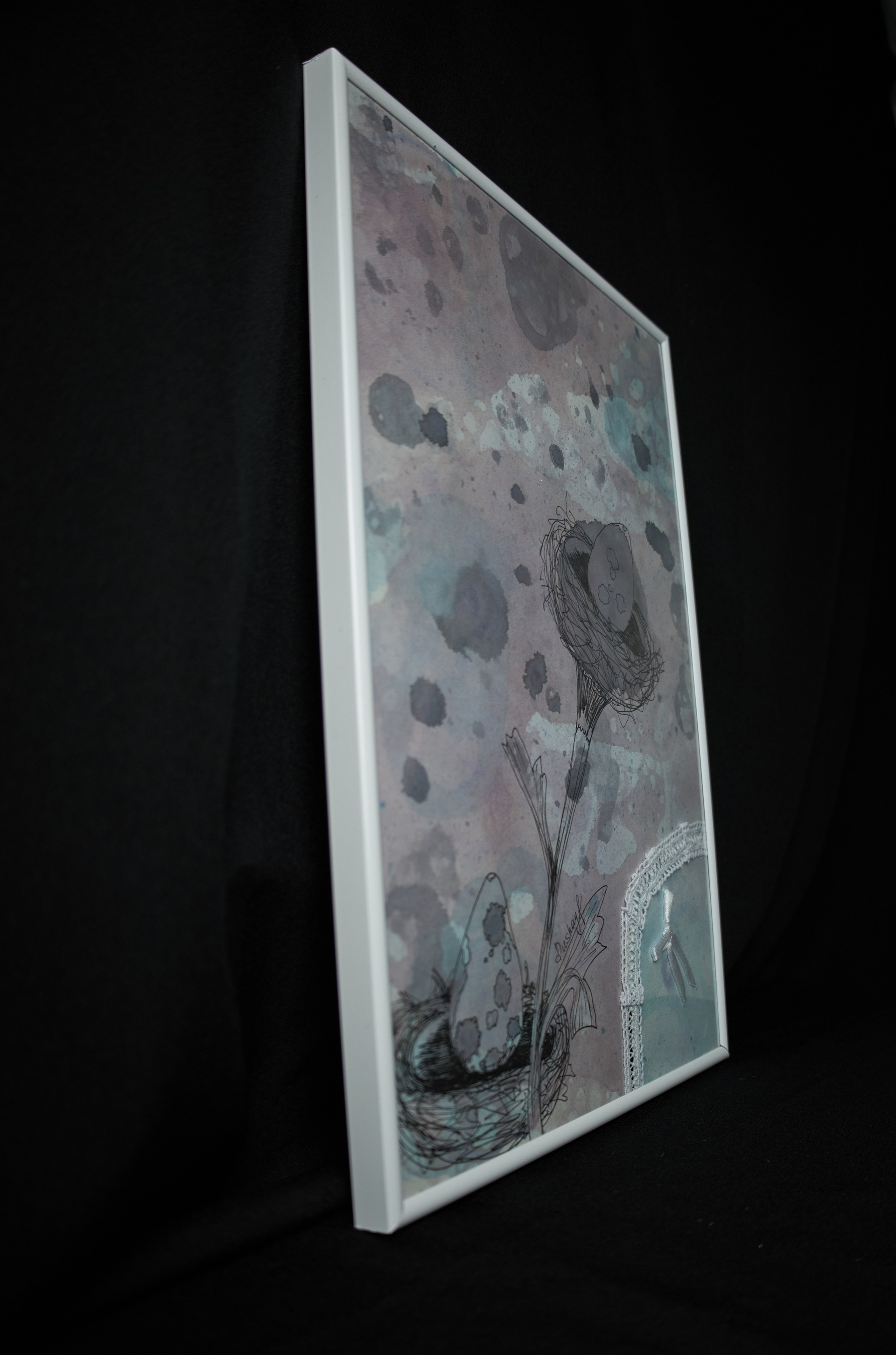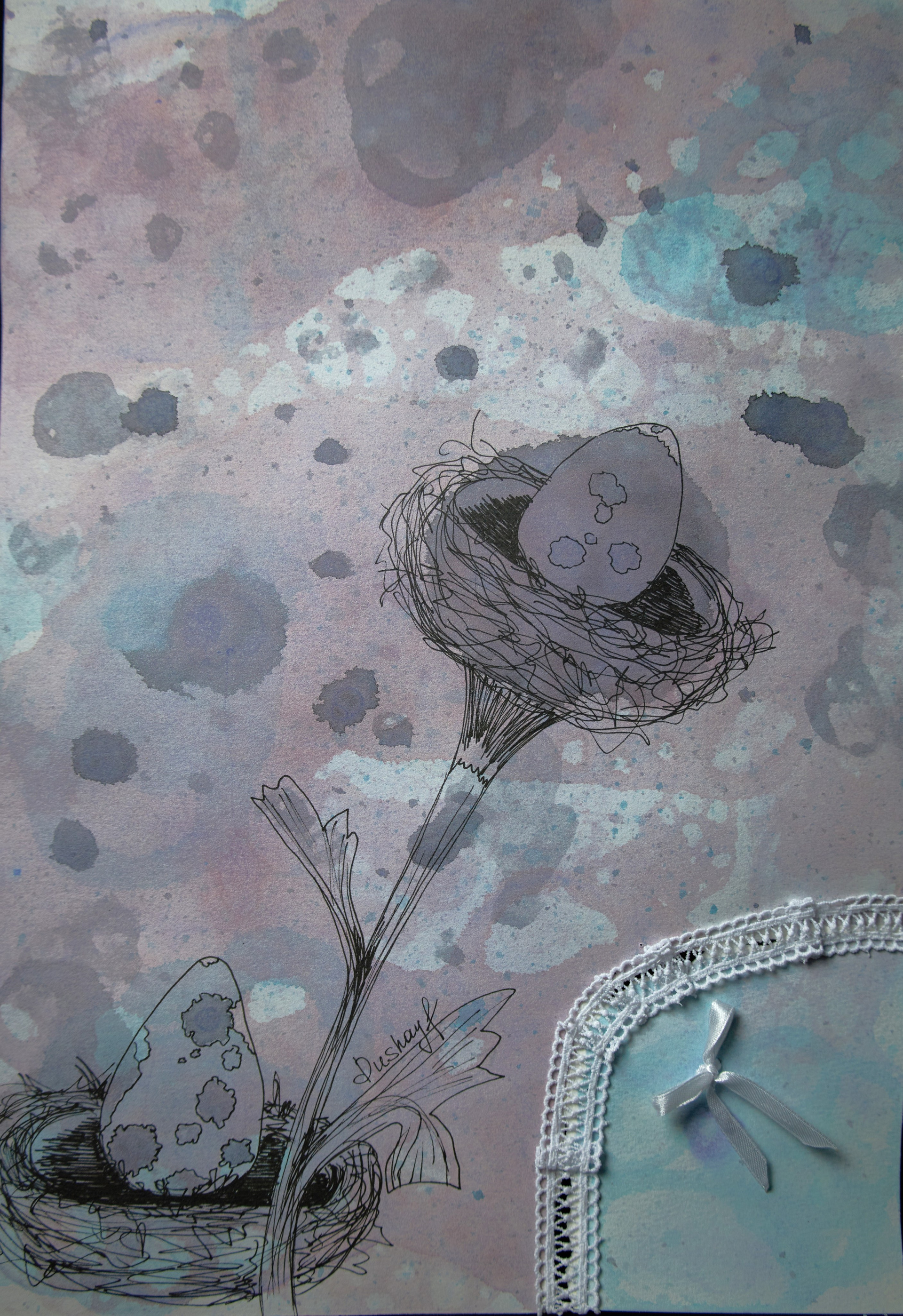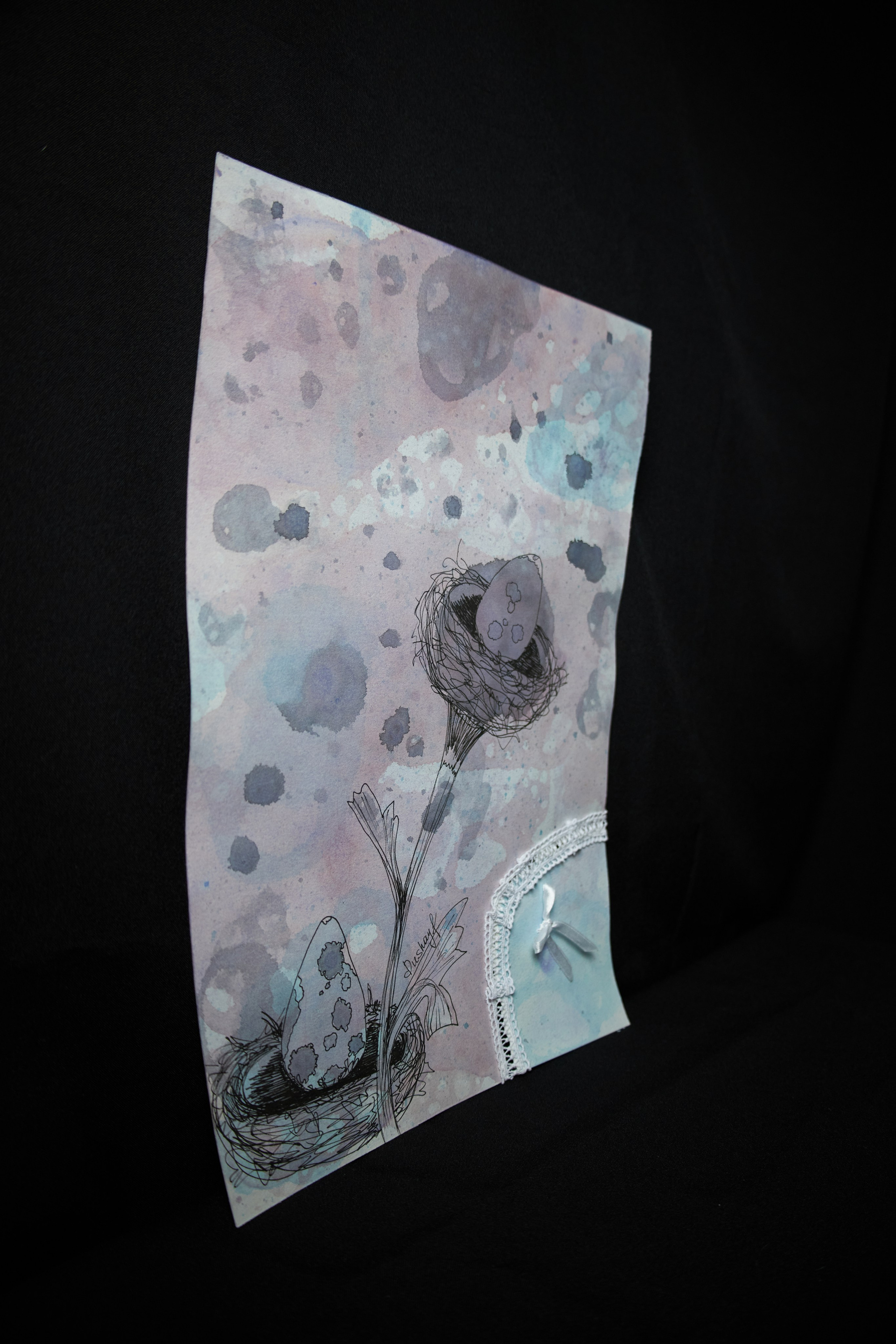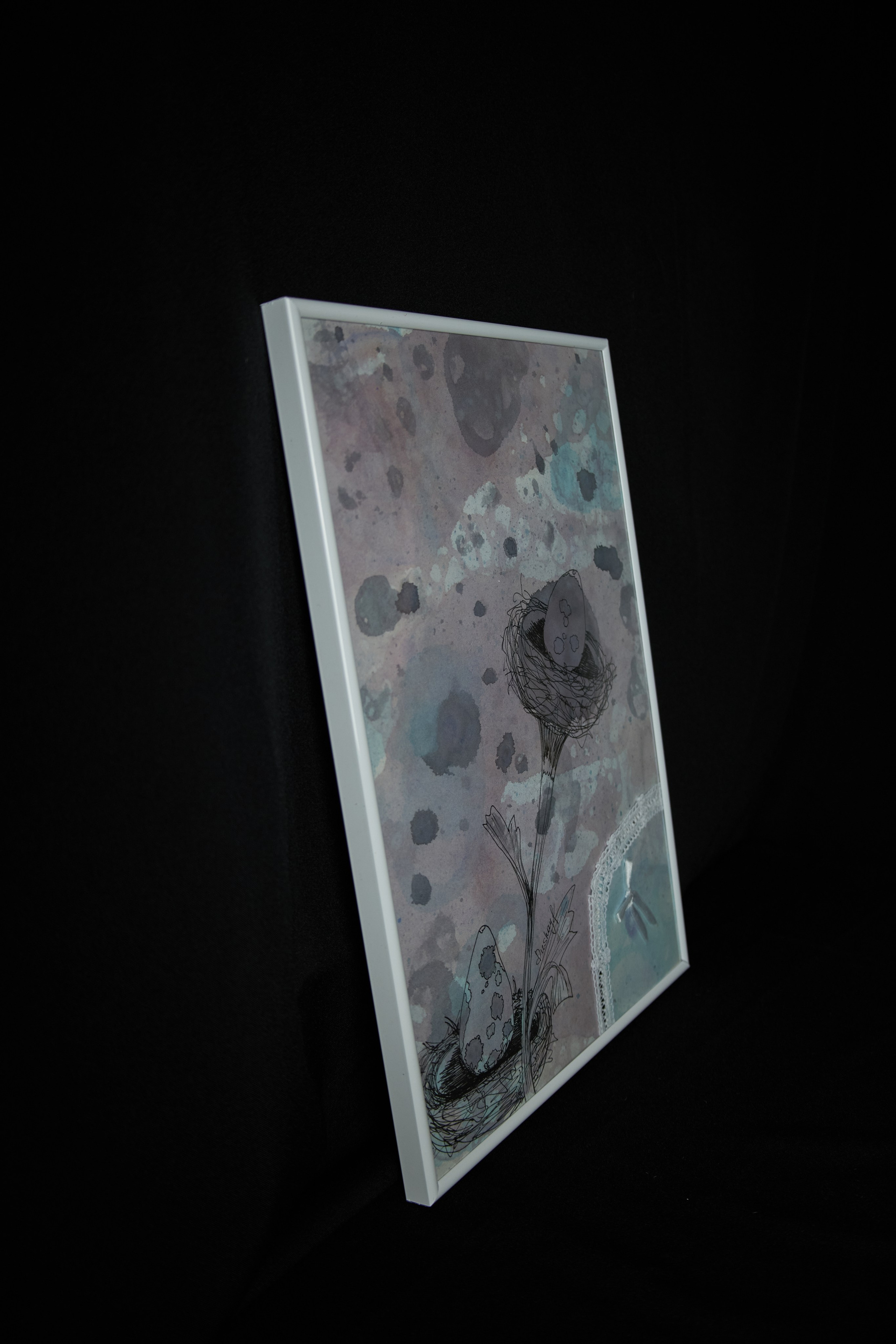 Эта авторская работа в смешанной технике раскрывает причудливый природный сюжет: два изящных гнезда с крапчатыми драконьими яйцами словно растущие цветы. Тонкие линейные линии переплетаются с мягкими акварельными переходами, абстрактными брызгами и необычным элементом — кружевным текстилем, создавая тактильную композицию. Фон выполнен в туманных оттенках лилового, серого и аквамарина с помощью мыльных пузырей, создавая атмосферу нежности, сновидений и лёгкого удивления. Работа звучит как визуальная поэзия, в которой современная ботаническая эстетика встречается с сюрреалистичным сновидением, создавая ощущение хрупкости, заботы и тихого волшебства. Притягивает взгляд необычной образностью, станет гармоничным украшением интерьера.