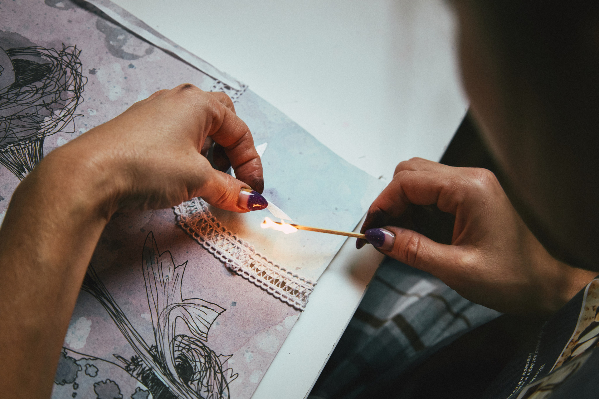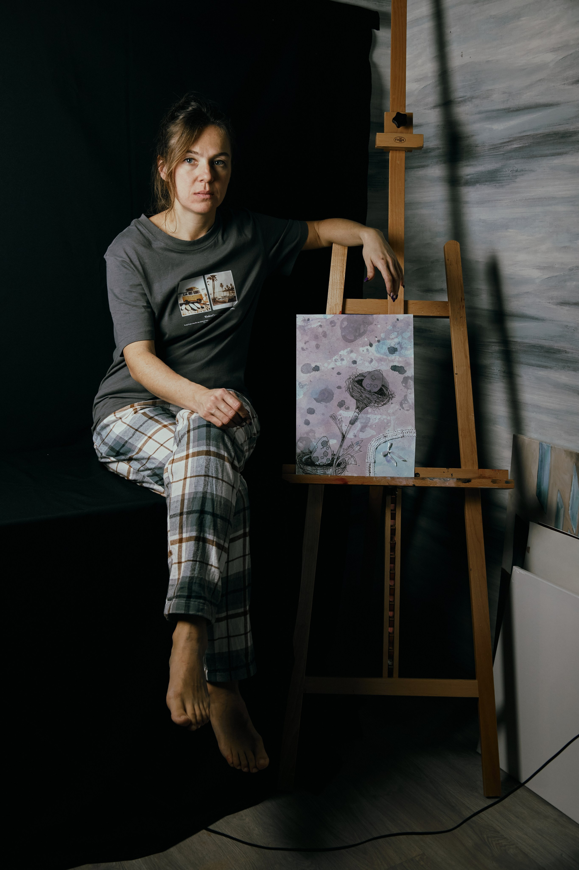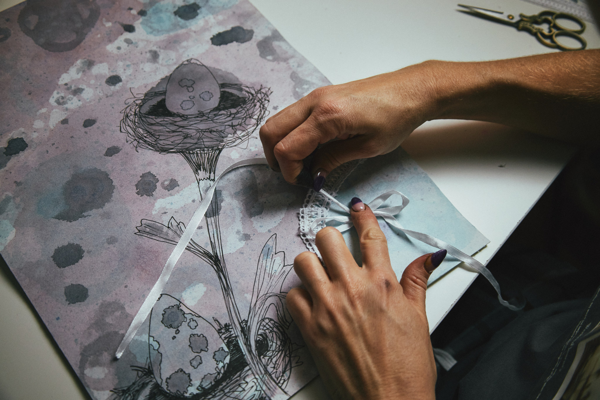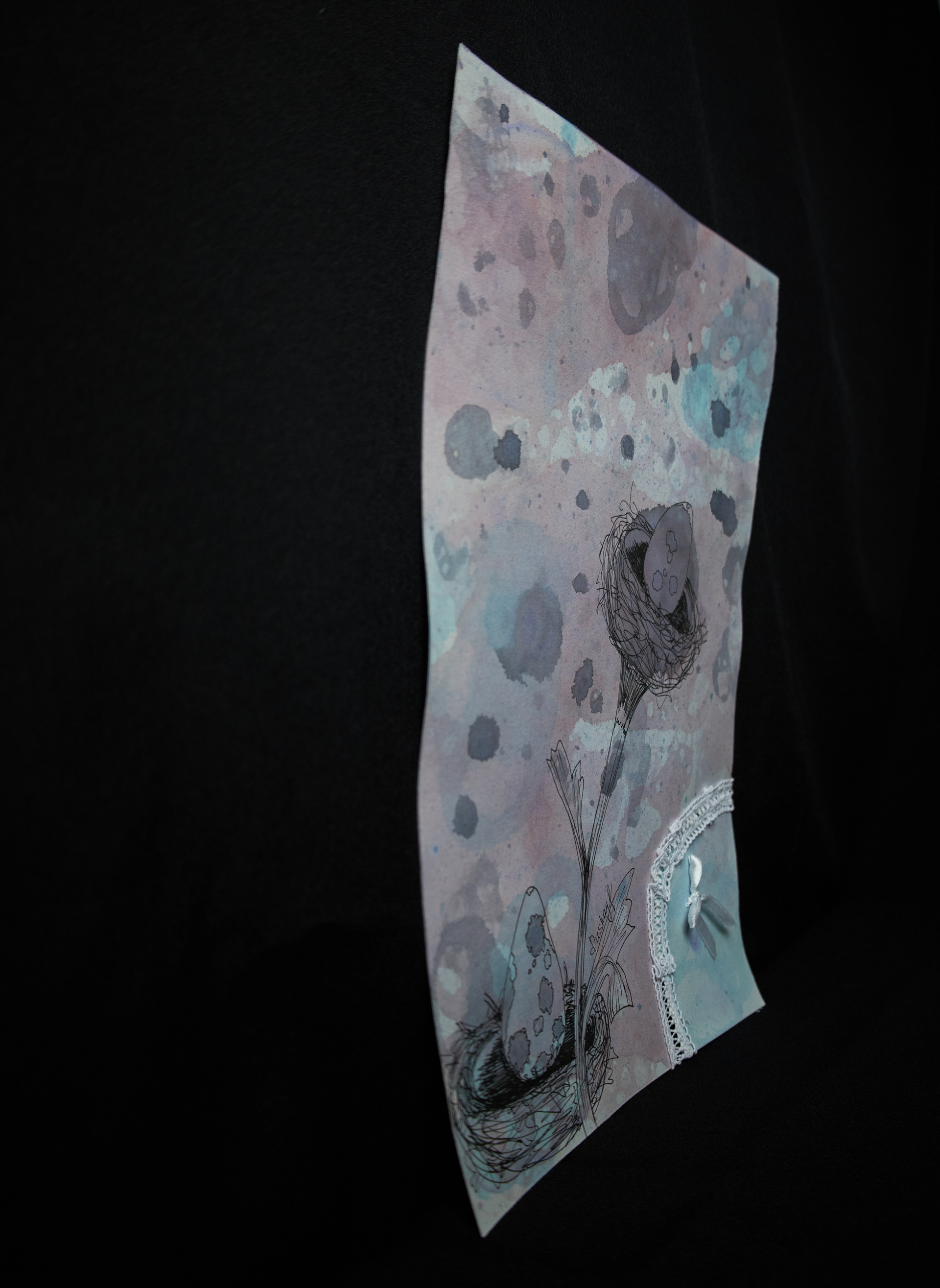 Эта авторская работа в смешанной технике раскрывает причудливый природный сюжет: два изящных гнезда с крапчатыми драконьими яйцами словно растущие цветы. Тонкие линейные линии переплетаются с мягкими акварельными переходами, абстрактными брызгами и необычным элементом — кружевным текстилем, создавая тактильную композицию. Фон выполнен в туманных оттенках лилового, серого и аквамарина с помощью мыльных пузырей, создавая атмосферу нежности, сновидений и лёгкого удивления. Работа звучит как визуальная поэзия, в которой современная ботаническая эстетика встречается с сюрреалистичным сновидением, создавая ощущение хрупкости, заботы и тихого волшебства. Притягивает взгляд необычной образностью, станет гармоничным украшением интерьера.