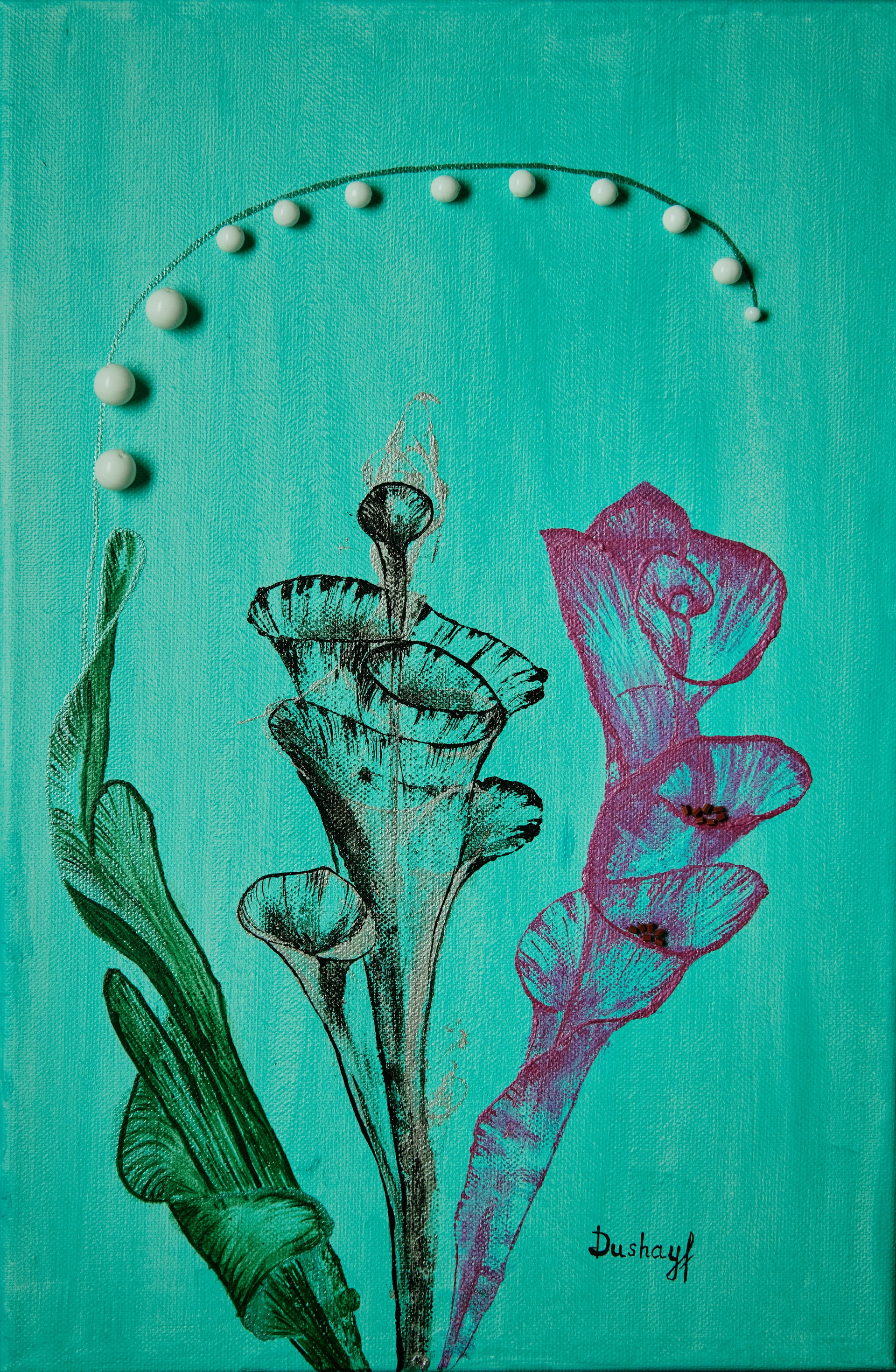 Эта флоральная работа в смешанной технике представляет собой ботанический натюрморт, дополненный настоящими вручную пришитыми бусинами. Тонкая линейная графика и мягкая светотень придают цветам ощущение движения и сдержанной элегантности.
