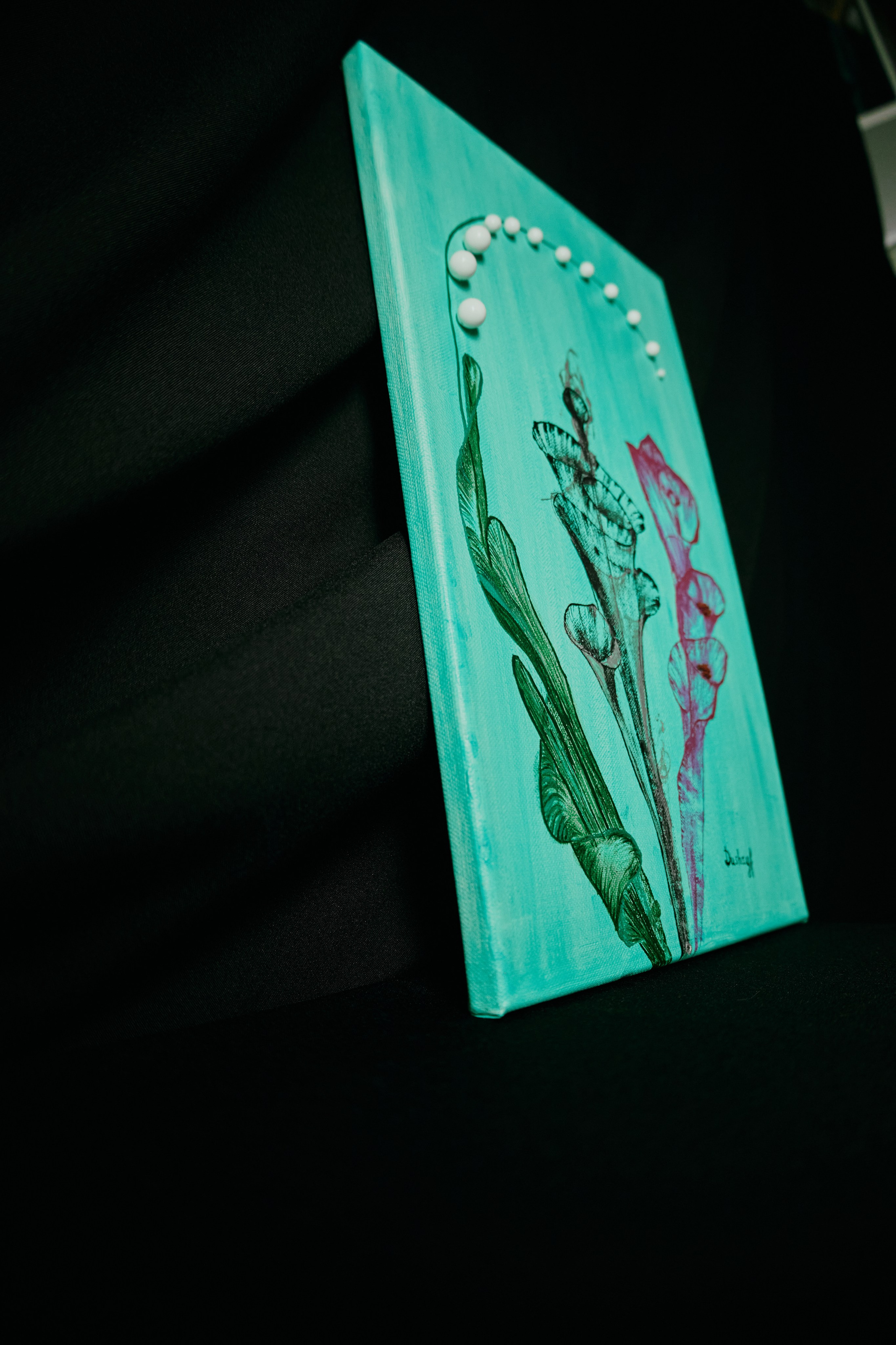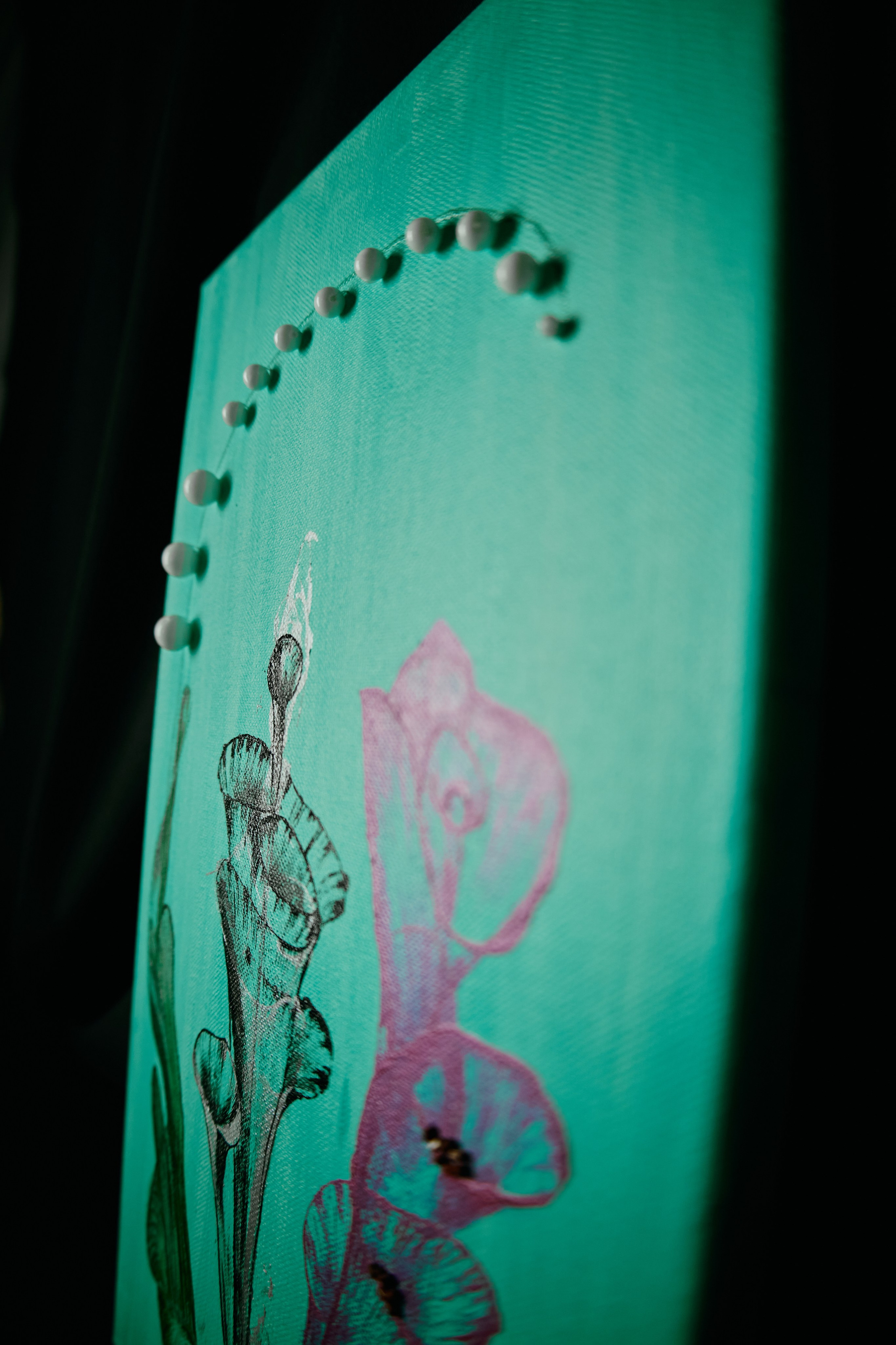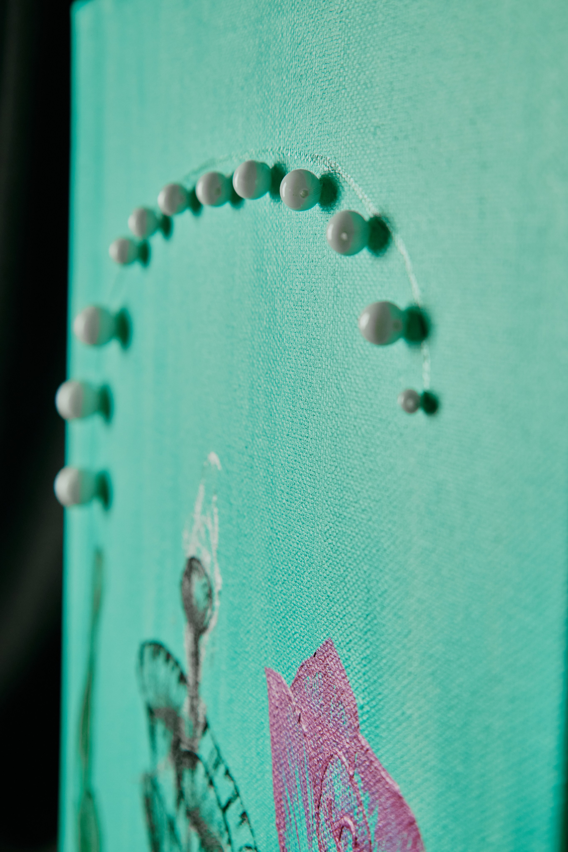 На мягком бирюзовом фоне работа излучает свежесть, спокойствие и ясность. Бусины добавляют глубину и игру света, превращая картину не только в визуальный, но и тактильный, почти скульптурный объект.