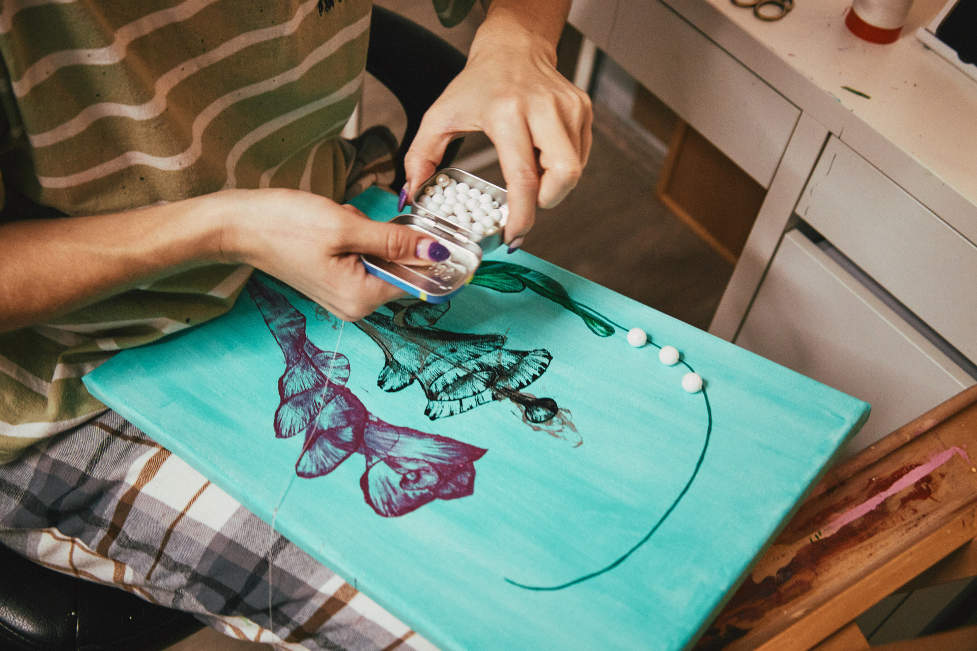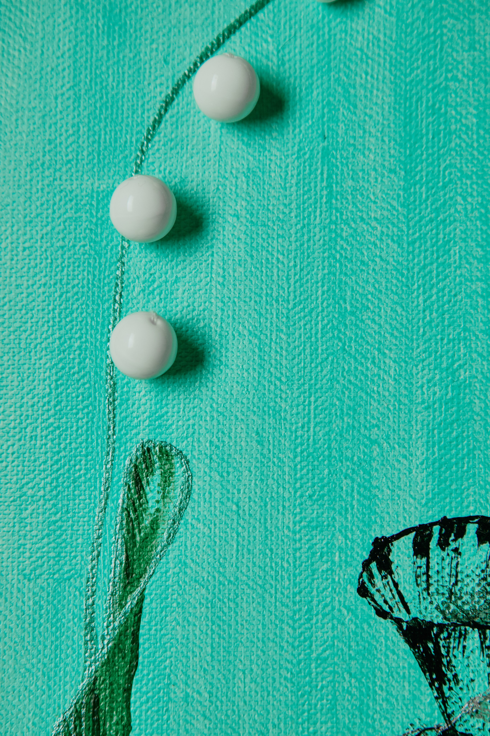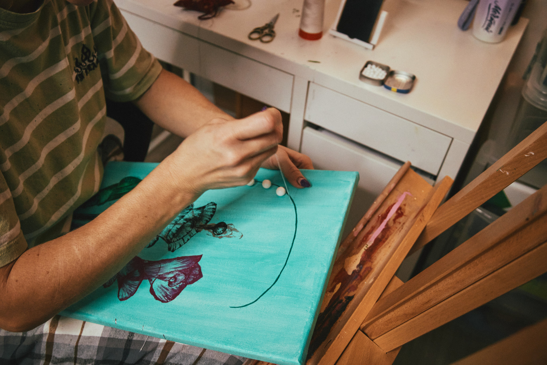 На мягком бирюзовом фоне работа излучает свежесть, спокойствие и ясность. Бусины добавляют глубину и игру света, превращая картину не только в визуальный, но и тактильный, почти скульптурный объект.